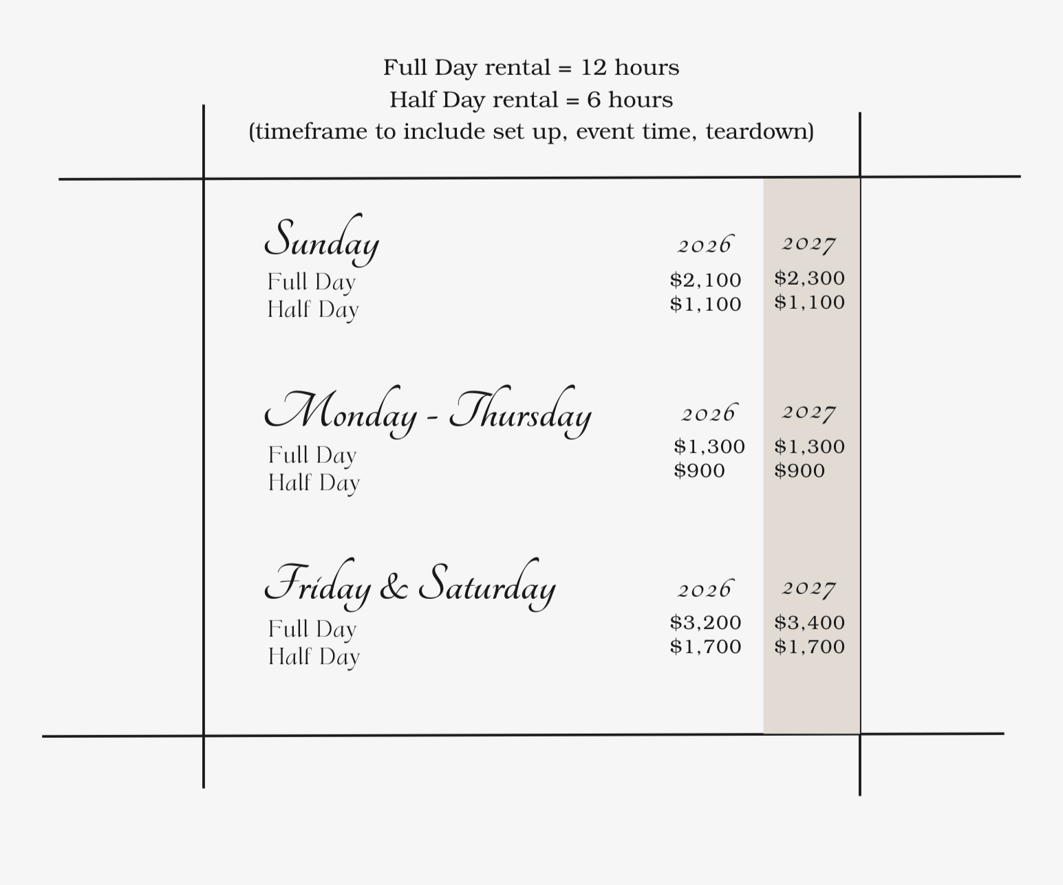 * Wedding Ceremony and/or Receptions require a Full Day rental